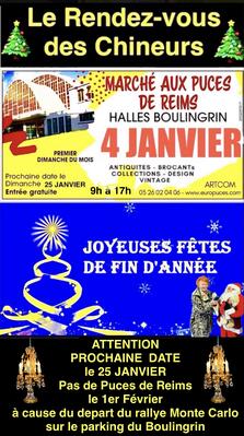 attention notre prochaine date sera le 25 janvier car il n’y aura pas de puces de reims le 1er février à cause du départ du rallye de monte carlo sur la totalité du parking du boulingrin