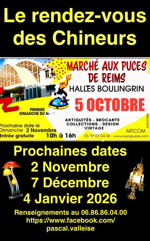 Les puces de reims le rendez vous des chineurs le premier dimanche du mois aux halles boulingrin pour tous renseignements n’hésitez pas à me contacter soit par sms ou directement par téléphone (voir numéro plus bas )je vous répondrai avec plaisir