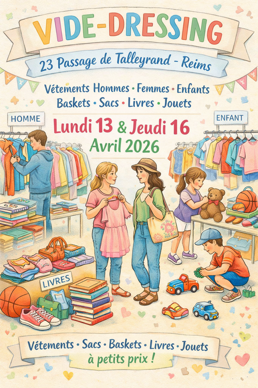 Une multitude de vêtement homme, femmes, enfants, baskets toutes tailles et tous styles ; ainsi que des sacs, livres et jouets.