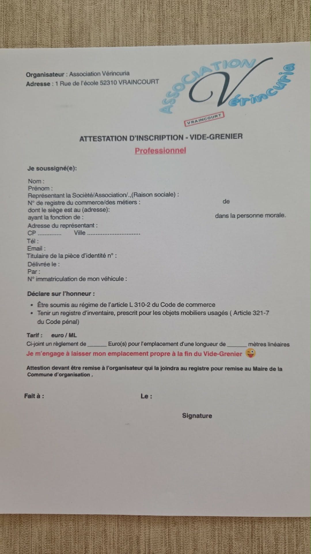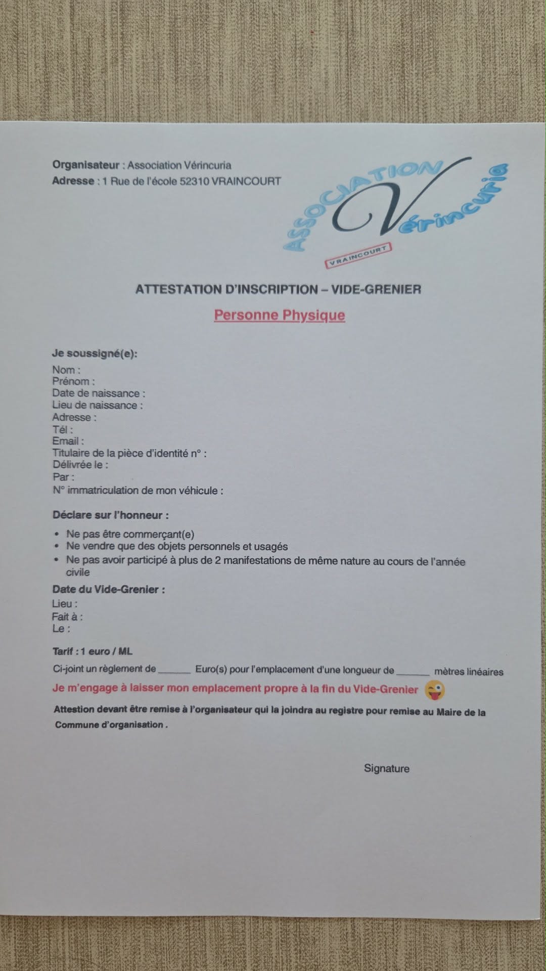 - remplir le document et le rapporter le jour.J, pour le paiement ça sera le jour du vide-grenier