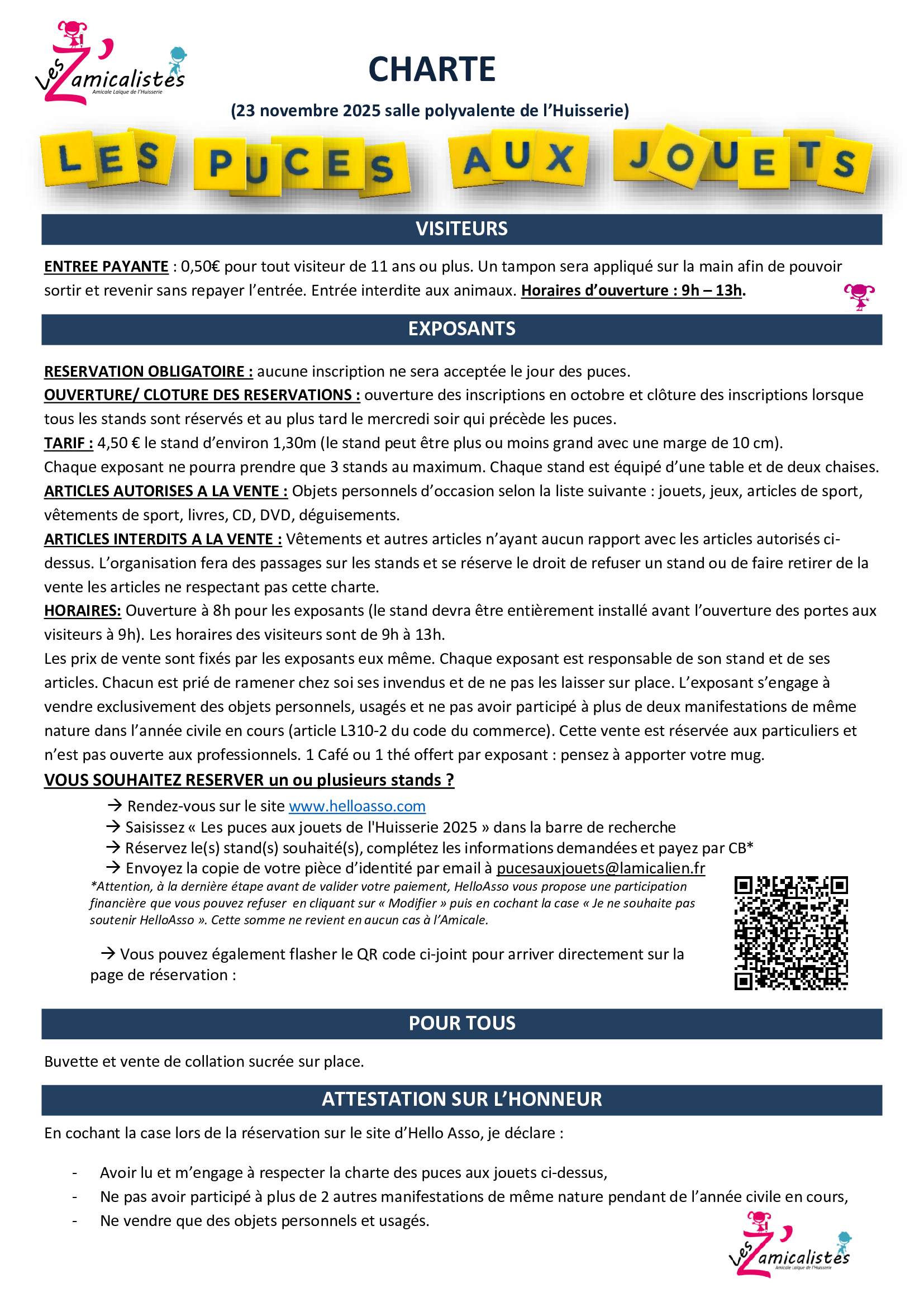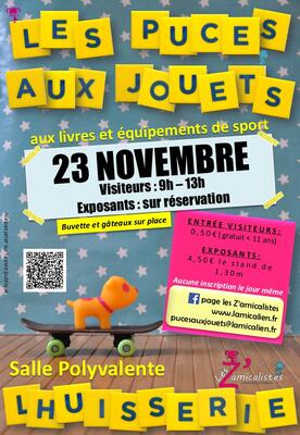 Puces aux jouets de l'huisserie dimanche 23 novembre 2025 puces aux jouets, livres et équipements de sport organisée par l'amicale laïque de l'huisserie. Lieu : salle polyvalente de l’huisserie visiteurs : de 9h à 13h. Entrée 0,50€ par personne (gratuit pour les moins de 11 ans). Cette participation est demandée à toute personne non enregistrée sur un stand exposant. Buvette et collation sucrée sur place. Contact: a bientôt