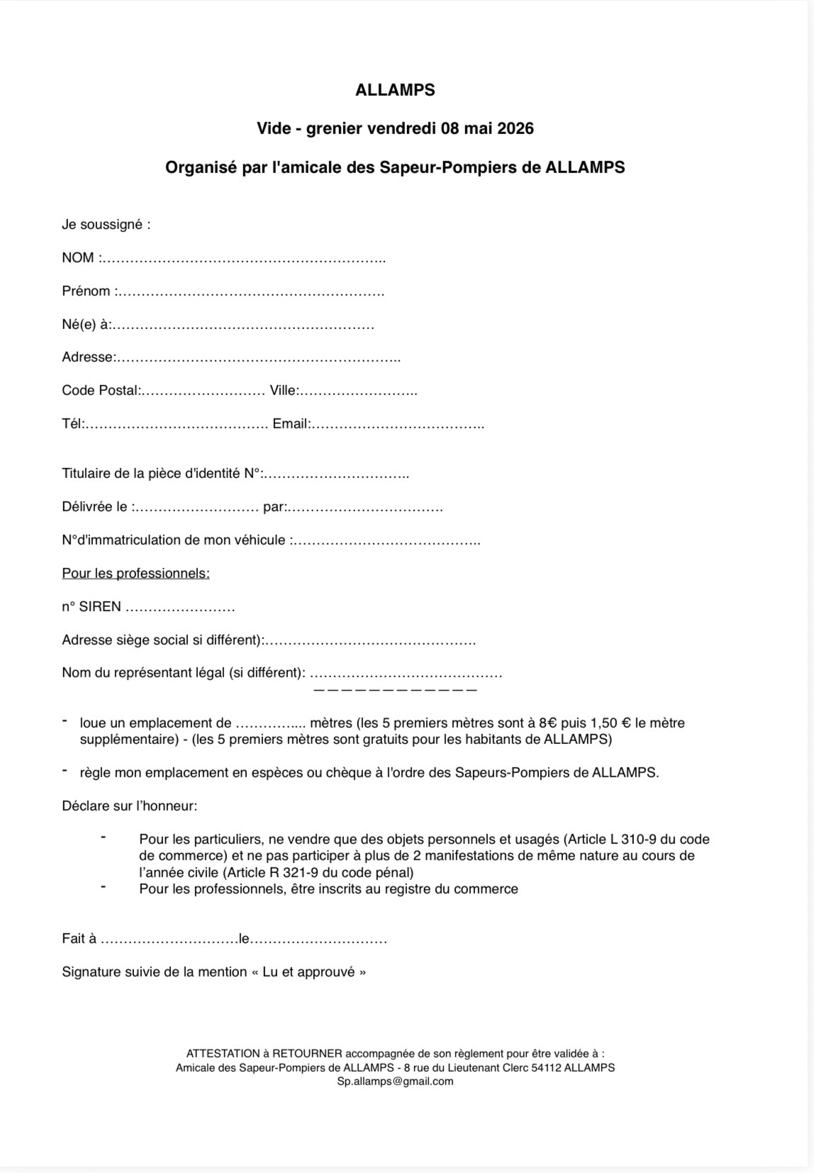 Chaque année( 8 mai) ,l'amicale des sapeurs pompiers d'allamps organise un vide grenier.