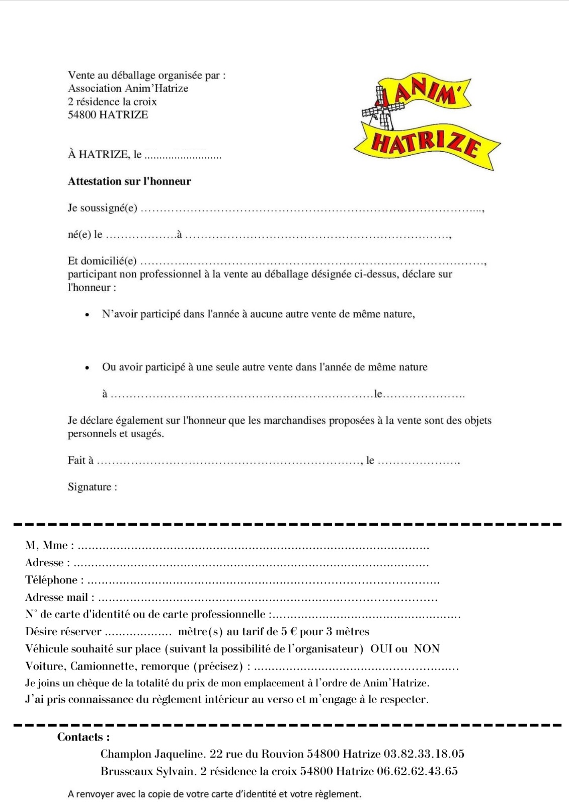 L’association anim’hatrize organise sa 24e brocante le dimanche 26 avril 2026 dans les rues du village. L’accueil des brocanteurs se fera dès 5h par notre équipe. L’emplacement est à 5€ les 3m. L’entrée est gratuite pour les visiteurs. Buvette, café, croissants et restauration disponible sur place. La vente de produits alimentaires, produits neufs (vêtement, jouets, matelas, etc.) et d´animaux est interdite. Réservation : www.animhatrize.fr (nouveau) par mail : par téléphone mme champlonmr brusseaux venez nombreux