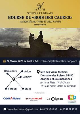 Suite au succès de ses deux premières bourses aux antiquités militaires et vieux papiers du "bois des caures", l'association woëvre et othain 14/18 a le plaisir de vous convier à la troisième édition, prévue le dimanche 22 février 2026, au domaine des roises, à azannes-et-soumazannes (55)!
