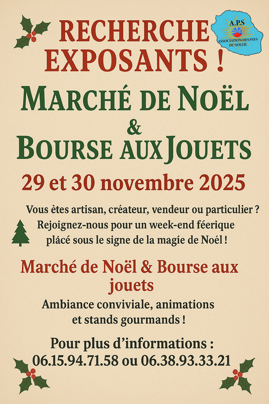 L’association des pays du soleil (aps) a le plaisir de vous informer de l’organisation de son marché de noël et de sa bourse aux jouets, prévus les 29 et 30 novembre 2025.