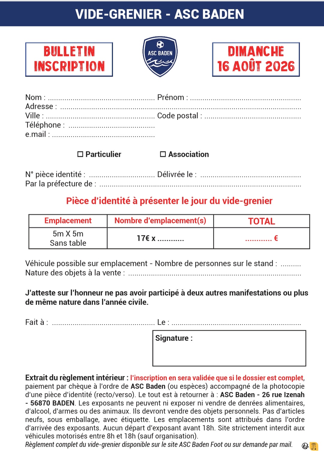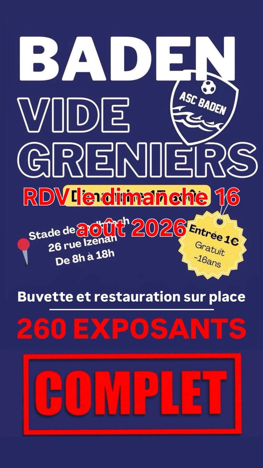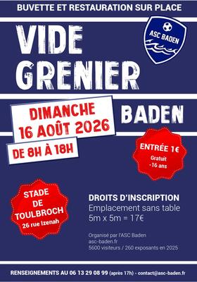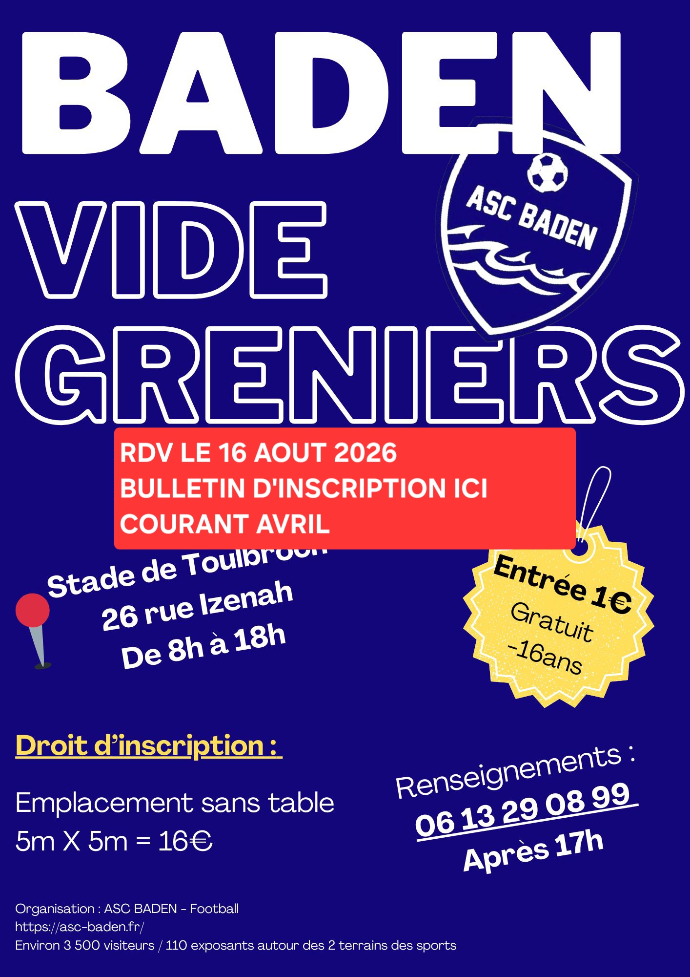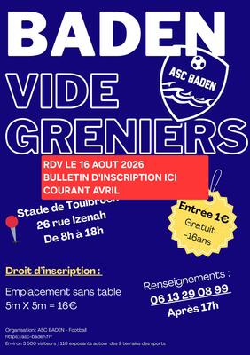 le club de football de l'asc baden organise le dimanche 16 aout 2026 son traditionnel grand vide grenier annuel.