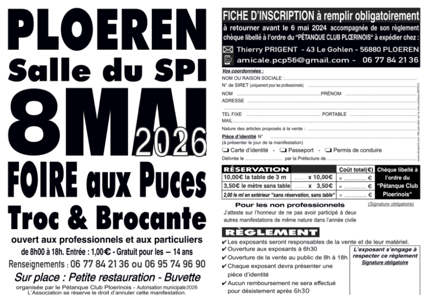 Ploeren 8 mai 2026 troc et puces de 8h 18h entrée 1€ gratuit pour les - 14 ans. Petite restauration buvette