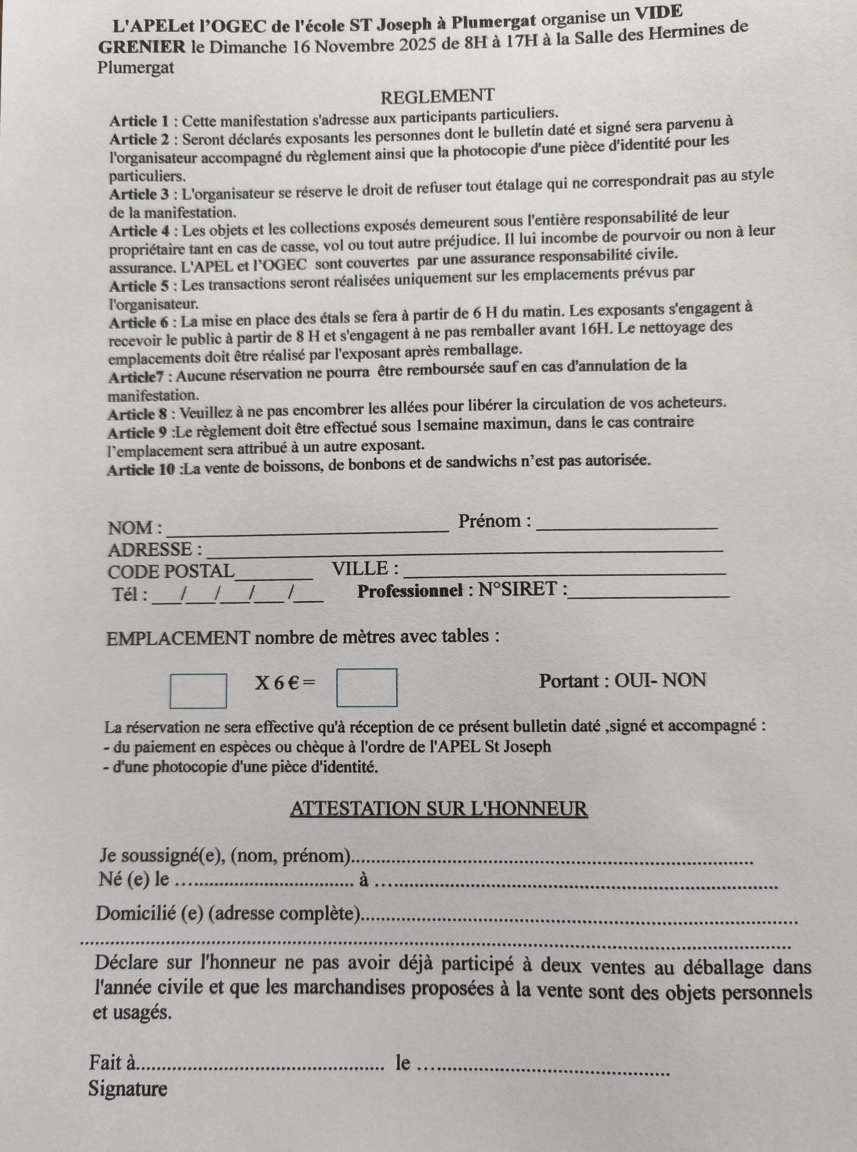 Vide grenier au profit des associations apel et ogec de l'école saint joseph de plumergat. Ouvert de 8h à 17h. Buvette et restauration sur place.