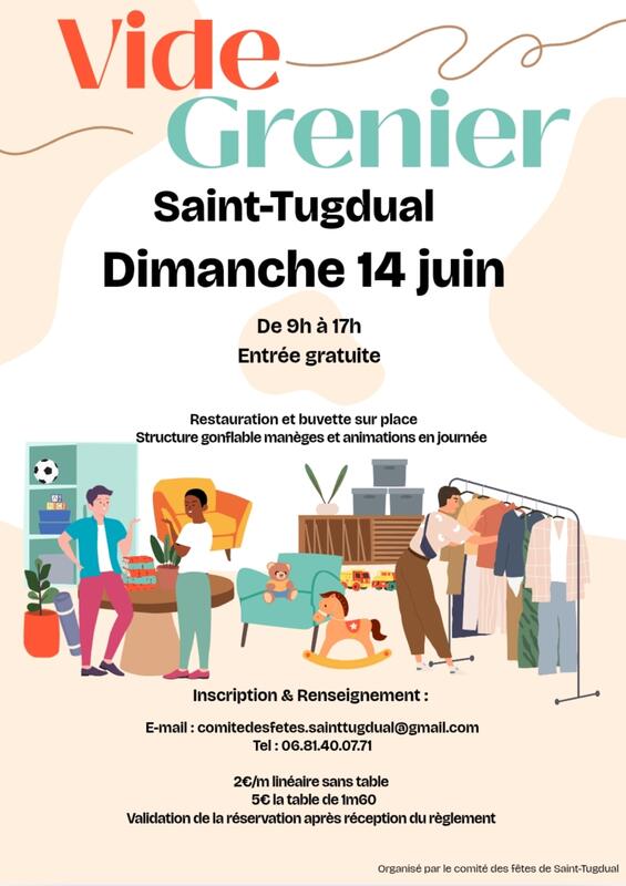 Vide grenier dimanche 14 juin de 9h à 17h, durant les fêtes locales de saint tugdual (du vendredi 12 juin au lundi 15 juin ) buvette et restauration sur place, manèges et structure gonflable, concours de boules bretonne en journée, repas en soirée. Au plaisir de vous recevoir