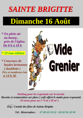 Proche de la forêt de quenecan, le comité des fêtes de sainte brigitte organise son 19- -ème vide grenier , dès 07 h 00 accueille des brocanteurs , café et gâteaux offert pour les exposants , ouverture à 08 h 00 pour les visiteurs .