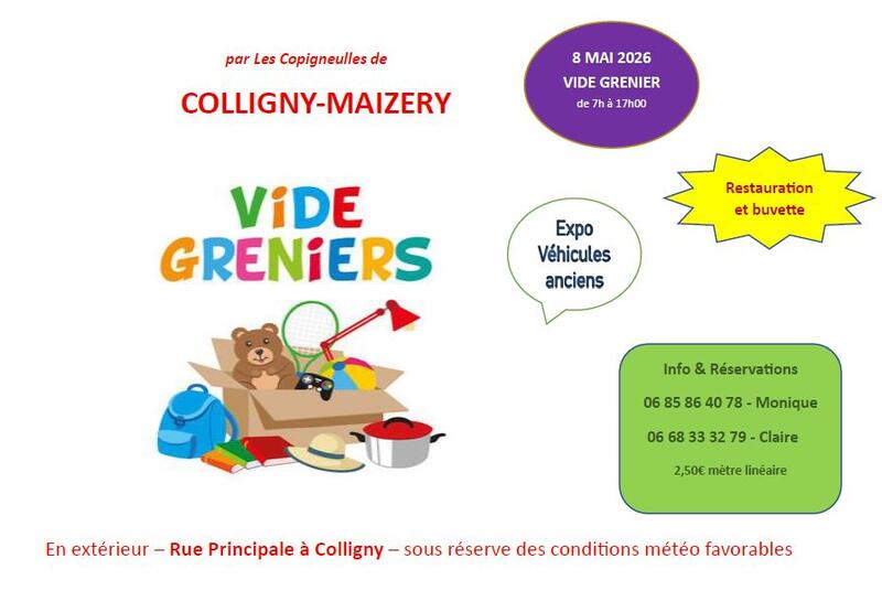 Organisation et animation ( restauration et buvette) proposée par les copigneulles de colligny-maizery. Rue principale en extérieur, la rue est sécurisée et exclusivement réservée aux piétons de 7h à 17h . Une exposition de véhicules anciens est associée. Sous réserve de conditions météo favorables . Parkings gratuits dans les rues adjacentes.