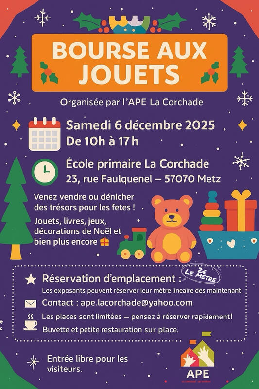 L’association des parents d’élèves de l’école primaire la corchade organise sa première bourse aux jouets le samedi 6 décembre 2025, de 10h à 17h, dans la cour de l’école la corchade à metz (57070).