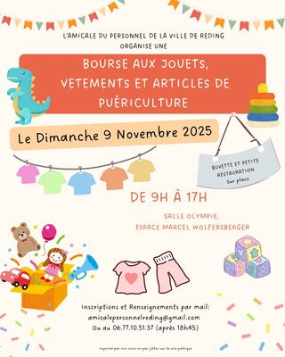 Bourse aux jouets, vêtements et articles de puériculture le 9 novembre 2025 de 9 h à 17 h, à la salle olympie de réding.