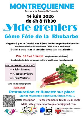 Le comité des fêtes rml avec l'aide de la municipalité et l'ascl organise sa traditionnelle fête de la rhubarbe, 6ème édition et son 12ème vide greniers à montrequienne (commune de rurange-lès-thionville), le dimanche 14 juin 2026. Restauration et buvette sur place. Stand de rhubarbe (tarte, vin, rubarbe fraiche, exposition, confitures, conseils, …) wc à disposition au centre socio culturel parking fléché depuis rurange et tremery. Entrée gratuite.