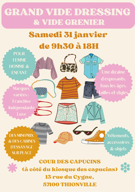 Premier grand vide dressing de 2026 ! Retrouvez nous le samedi 31 janvier de 9h30 à 18h dans la cour des capucins à thionville dans la cellule à côté du petit café/kiosque central. Une dizaine d’exposants avec leur tonne d’articles pour femme, homme et enfants à retrouver ! Également tout un espace vide grenier avec de vrais trésors à retrouver ! Les exposants sont de tous les âges, tailles (des petites aux grandes tailles) et styles afin qu’il y en ait pour absolument tout le monde.