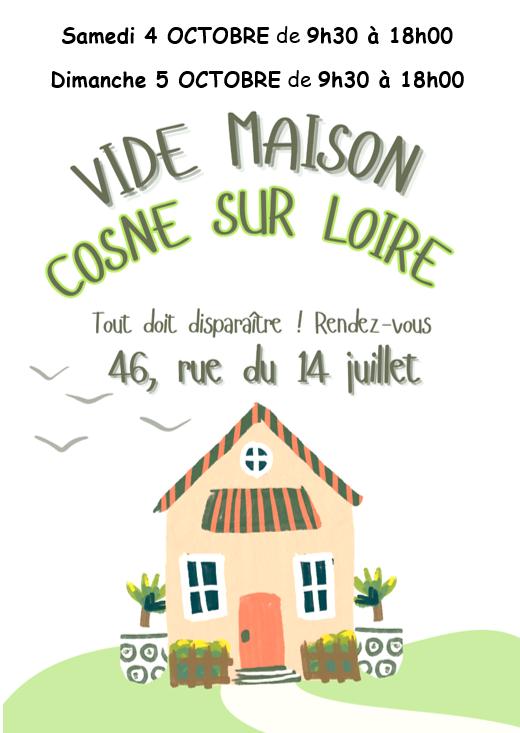 nous organisons un vide-maison au 46 rue du 14 juillet, 58200 cosne-sur-loire les 4 et 5 octobre. Nous vous accueillerons de 9h30 à 18h.