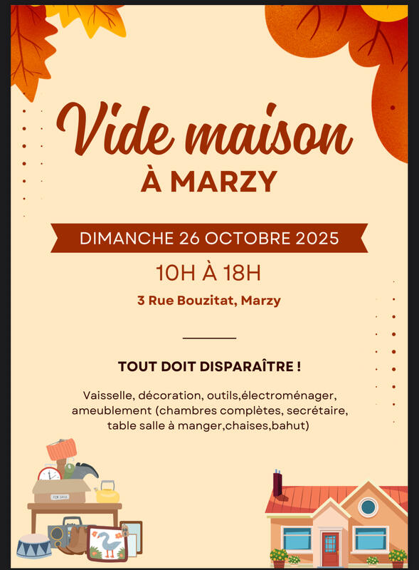 Vous trouverez des objets de décoration, de la vaisselle, des livres, de l’électroménager , du matériel médical , des rideaux , des outils de jardinage, des pots pour le jardin, des meubles : deux chambres complètes merisier et chêne , un canapé en cuir, une table basse, une bibliothèque, un meuble tv, une table , 5 chaises et son grand meuble bahut, une horloge