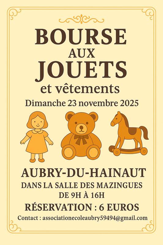 L'association ecole aubry a le plaisir de vous annoncer l'organisation d'une bourse aux jouets et aux vêtements pour enfants. L'occasion idéale pour dénicher de belles affaires, dans une ambiance chaleureuse et conviviale.
