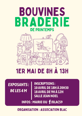 L'association bouvines l’aventure continue organise la traditionnelle braderie du 1er mai de bouvines. Rendez-vous au cœur du village historique de 8h à 13h pour dénicher de vrais trésors sur plus de 200 emplacements.