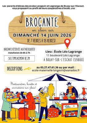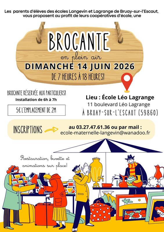 Cette brocante se déroulera en extérieur le dimanche 14 juin 2026 à la cour de l'école léo lagrange, située au 11 boulevard léo lagrange à bruay-sur-l'escaut (59860).