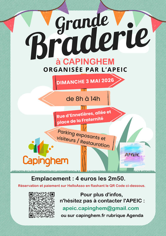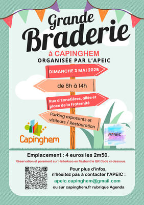 L'association des parents d’elèves indépendants de capinghem organise sa grande braderie traditionnelle à capinghem le dimanche 03 mai 2026 de 08h à 14h.