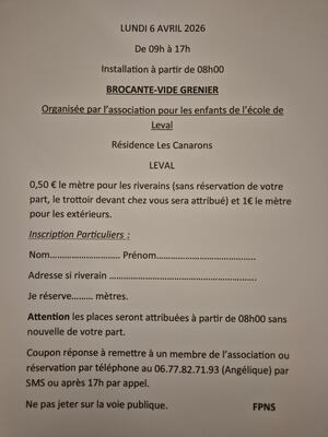 L'association pour les enfants de l'école de leval organise sa brocante de printemps.