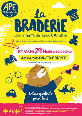 Braderie des enfants de jules et anatole, organisée par l'association des parents d'élèves des écoles jules simon et anatole france, quartier st maurice à lille. Jouets, livres, vêtements pour enfants, matériel de puériculture...