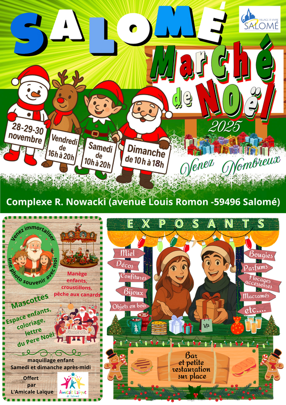 Rendez-vous les 28, 29 et 30 novembre sur le parvis et dans la salle des fêtes du complexe raymond nowacki (avenue louis romon – 59496 salomé) pour partager un moment chaleureux et festif.