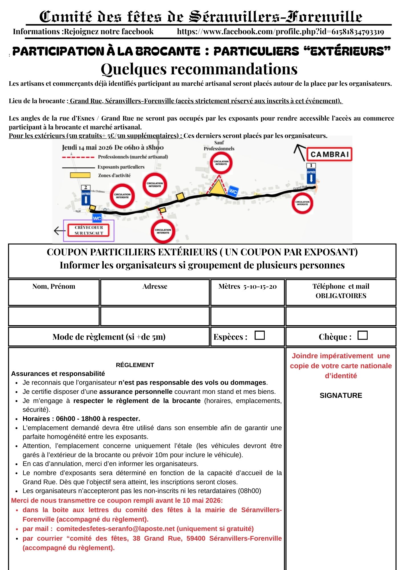 Si règlement (plus de 5m) : chèque à l'ordre du comité des fêtes séranvillers-forenville