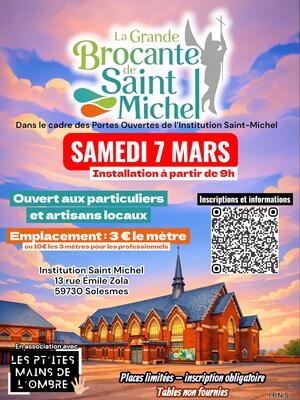 À l’occasion des portes ouvertes du collège saint michel, l’association les pt'ites mains de l’ombre organise une grande brocante ouverte au public, mêlant vide-greniers de particuliers et marché de producteurs et professionnels locaux.