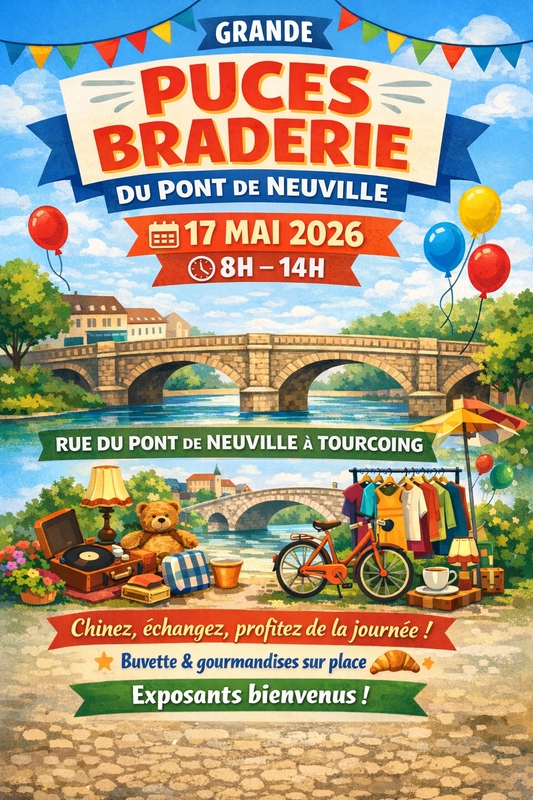 Inscriptions le 2 mai pour les riverains et le 9 mai 2026 pour les particuliers et professionnels, 8 euros pour les particuliers et 11 euros pour les professionnels, les 3 mètres, liquide et chèques accepté , pas de carte bleu, pièces d'identité de la personne qui prend l'emplacement obligatoire ainsi que la carte professionnel pour les professionnel, déballage de 6 h a 8 h, plus aucun véhicule ne doit rester sur emplacement après 8h (sauf véhicule pour blocage des rues), remballage pas avant 14h ,pas de vente alimentaire, petite restauration sur place commerces du pont de neuville , transport en commun :métro ligne 2 et bus arrêt pont de neuville