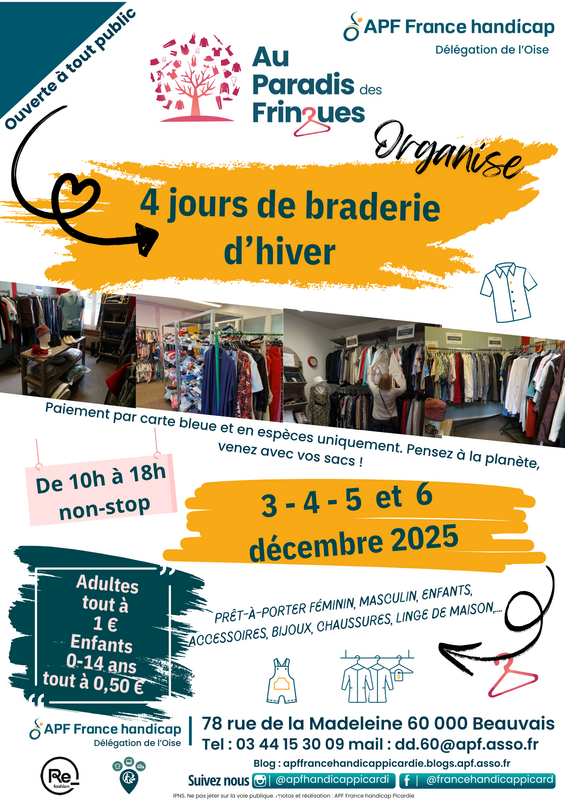 La friperie solidaire « au paradis des fringues », portée par apf france handicap, vous invite à participer à quatre jours exceptionnels de braderie solidaire !