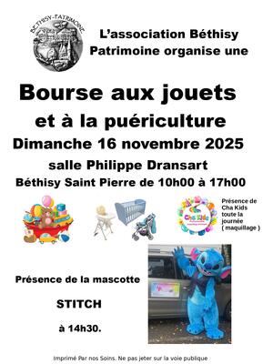 L'association bethisy patrimoine organise le dimanche 16 novembre 2025 de 10h à 17h sa bourse aux jouets et articles de puericulture dans la salle philippe dransart de bethisy saint pierre - 60320 - buvette, petite restauration sur place, accès pmr, dans une salle chauffée et couverte, animations prévues ce jour : cha'kids ( maquillage artistique ) et la mascotte stitch sera présente à 14h30. Venez nombreux, partagez cet évènement et à très vite !