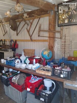 Outillages, accessoires de jardin cartes postales, timbres, vinyls , vaisselles, petit mobilier, vhs, ..