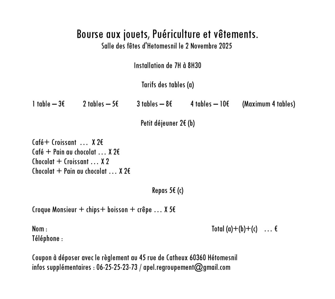 Bonjour, nous vous proposons une bourse aux jouets le 2/11/25 3€ 1 table 5€ les 2. (4 tables max par réservation) arrivée des exposants de 7h à 8h30. Ouverture au public de 9h à 17h. Repas et petit déjeuner sur réservation repas 5€ (croque monsieur + chips + boisson + crêpe) petit déjeuner 2€ (café ou chocolat + croissant ou pain au chocolat) pour réserver ou des renseignements supplémentaires: ou