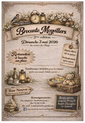 La 3ᵉ brocante de moyvillers se tiendra le dimanche 3 mai 2026 de 6h à 18h, au cœur du village, dans une ambiance conviviale.