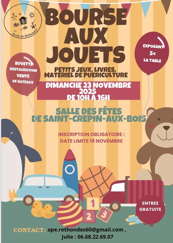 Ll’ape de l école de rethondes organise une bourse aux jouets (jeux, livres, matériel de periculture…) le dimanche 23 novembre.