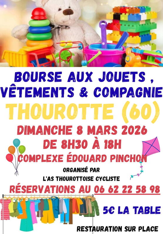 Bourse aux jouets, vêtements et compagnie au sein du complexe polyvalent edouard pinchon à thourotte (60). Parking disponible. Petite restauration sur place.