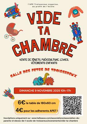 L'association des parents d'élèves de troissereux organise un grand "vide ta chambre" dimanche 9 novembre de 10h à 17h dans la salle des fêtes de troissereux !