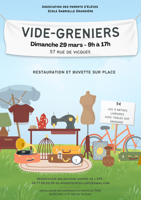 L’association des parents d’élèves de l’école gabrielle grandière organise son vide-greniers le dimanche 29 mars, de 9h à 17h, au 57 rue de vicques (dans la cour arrière de l'école).