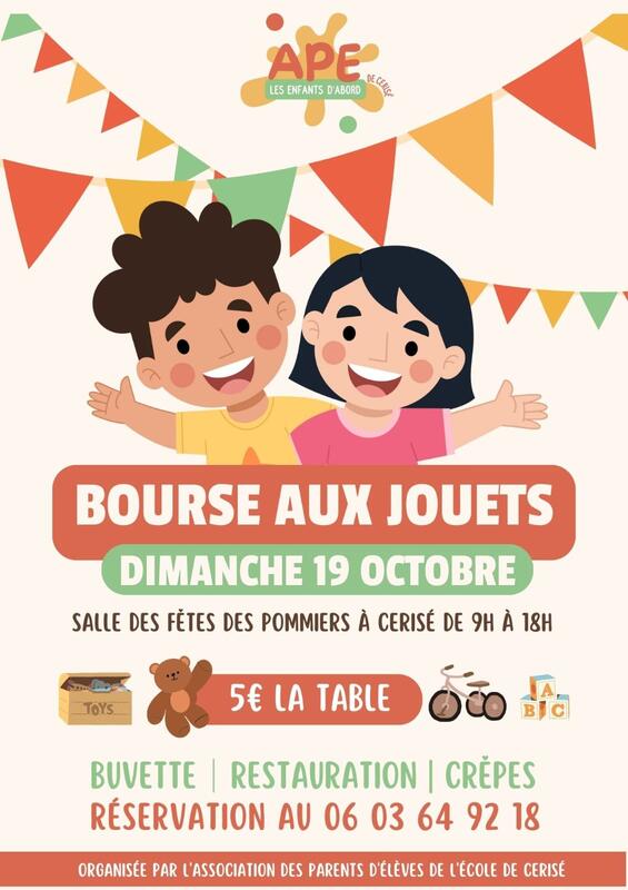 l'ape de l'école de cerisé organise sa bourse aux jouets le dimanche 19 octobre à la salle des fetes des pommiers de la commune.