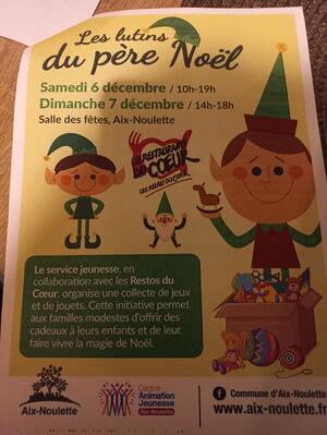Le service jeunesse d aix noulette organise son marché de noël en collaboration avec les restos du cœur, une collecte de jouets sera faite .La présence du père noël, ventes d objets, ateliers culinaires, boîtes aux lettres du père noël, ateliers créatifs, mascotte family s etrestauration sur place.