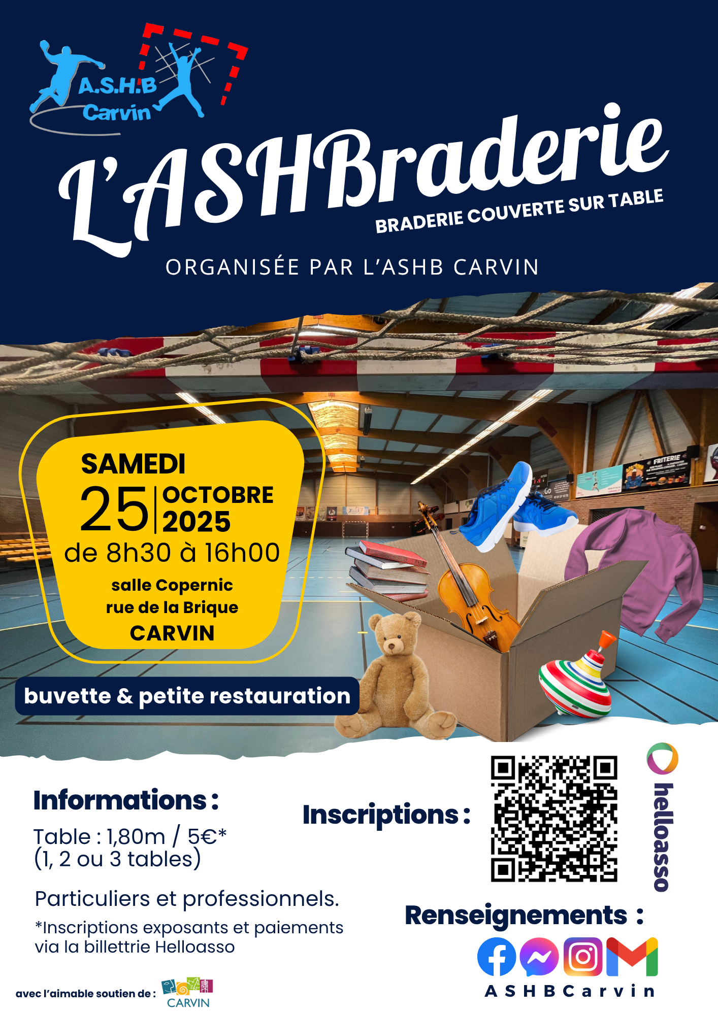 L’ashb carvin (club de handball) organise sa braderie le samedi 25 octobre, 8h30–16h, à la salle copernic (carvin 62220). Particuliers vendeurs et chineurs se retrouvent pour donner une seconde vie aux objets : vêtements, livres, jouets, articles de sport, déco… venez chiner et soutenir le club !