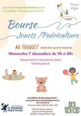 L'association sourires d'opale (association du service de pédiatrie du cham) organise une bourse aux jouets / puériculture.