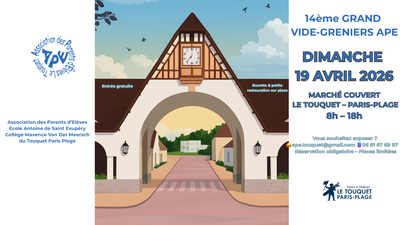 L’association des parents d’élèves (ape) de l’école antoine de saint-exupéry et du collège maxence van der meersch organise son 14ᵉ grand vide-grenier au marché couvert du touquet-paris-plage. Dimanche 19 avril 2026 de 8h à 18h venez chiner, découvrir de bonnes affaires et profiter d’un moment convivial en famille dans un cadre couvert et agréable. De nombreux exposants seront présents pour proposer : livres, jouets, vêtements, objets vintage, décoration, jeux, petits meubles et bien d’autres trésors à dénicher. Buvette et petite restauration sur place hot-dogs, boissons, café, pâtisseries et autres gourmandises vous permettront de profiter pleinement de la journée. Tous les bénéfices de cet événement sont destinés à soutenir les projets pédagogiques et les activités des élèves. Nous vous attendons nombreux pour partager ce moment convivial !