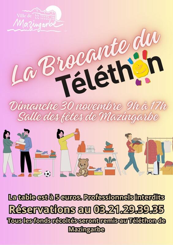 Le restaurant la cuisine à l'authentique et le comité téléthon de mazingarbe organise une brocante, le dimanche 30 novembre, de 9h à 17h à la salle des fêtes de mazingarbe, située rue décatoire.