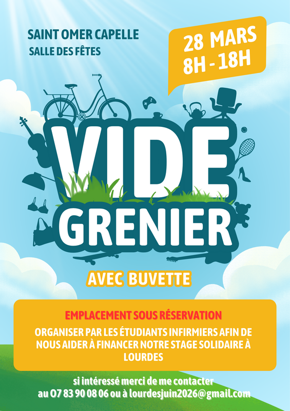Nous sommes des étudiants infirmiers et nous organisons un vide grenier afin de nous aider à financer notre voyage solidaire à lourdes, cela va nous permettre de donner nos soins aux pèlerins date : 28 mars horaires : 8h – 18h lieu : salle des fêtes de saint-omer-capelle venez chiner, vendre et passer un moment convivial ! Buvette sur place - chacun peut, s’il le souhaite, faire un don pour soutenir notre projet solidaire. On vous attend nombreux !