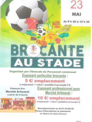 Brocante & marché artisanal à saint-venant préparez-vous à chiner, découvrir et vous faire plaisir ! Samedi 23 mai 2026 stade de saint-venant de 8h à 16h une journée conviviale ouverte à tous, entre bonnes affaires et créations uniques ! Au programme : * brocante (particuliers & professionnels) * marché artisanal (créateurs locaux, produits faits main) * objets uniques, déco, vêtements, bijoux… un moment convivial : venez en famille ou entre amis profiter d’une ambiance chaleureuse ! Sur place : * buvette & restauration * animations pour petits et grands ne ratez pas l’occasion de faire de bonnes affaires et de soutenir les artisans locaux !