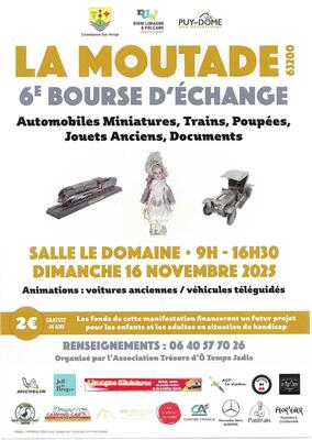 Venez découvrir la bourse aux jouets anciens de la moutade ! Une belle sélection d'articles vous y attend : petites voitures, trains, plein d'autres véhicules, de jolies poupées et même des documents anciens et publicitaires. Et ce n'est pas tout ! Dehors, vous pourrez admirer une exposition de voitures anciennes et des démonstrations de véhicules téléguidés. Cette sixième édition est aussi l'occasion de soutenir de beaux projets pour les enfants et les adultes en situation de handicap. On vous attend avec le sourire !
