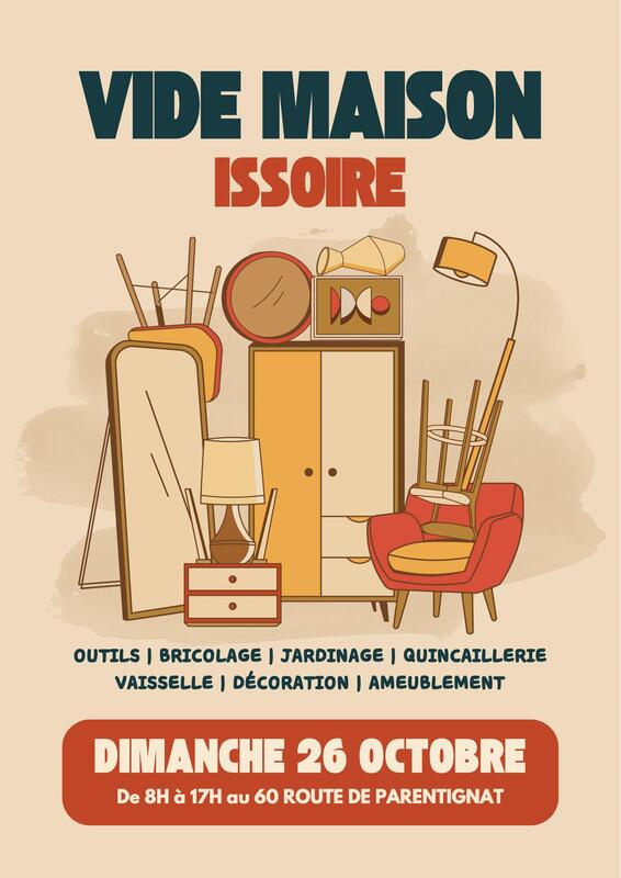 Nous organisons un vide-maison chez nos parents à issoire et ce sera pour vous l'occasion de faire vos emplettes parmi les nombreux outils de bricolage et jardinage, quincaillerie, meubles, vaisselle, bibelots, tableaux, luminaires, divers objets de décoration de bon goût. Le tout en bon état.